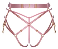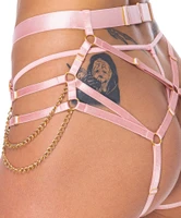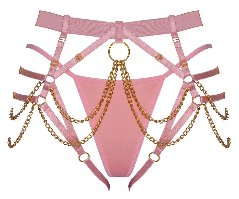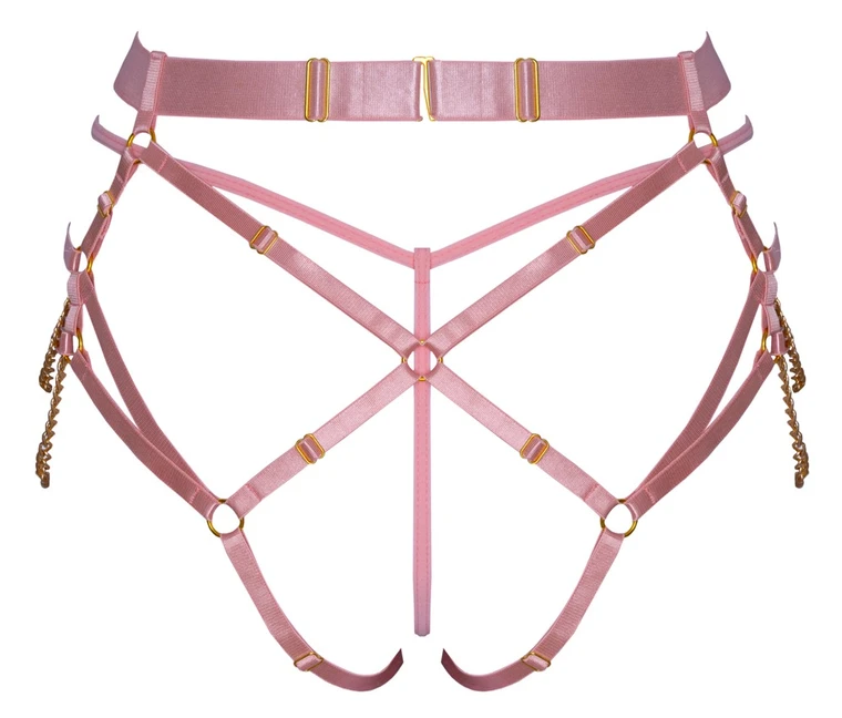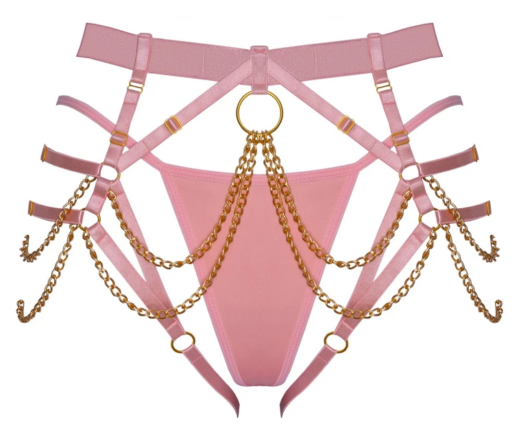 Extravagantní postroj Bad Kitty s mini tangy je stvořený pro ženy, které chtějí zvýraznit své křivky a dodat svému vzhledu odvážný, smyslný nádech. Kombinace růžových elastických popruhů, zlatých kovových doplňků a svůdně houpajících se řetízků vytváří vizuálně podmanivý efekt, který okamžitě přitáhne pozornost.