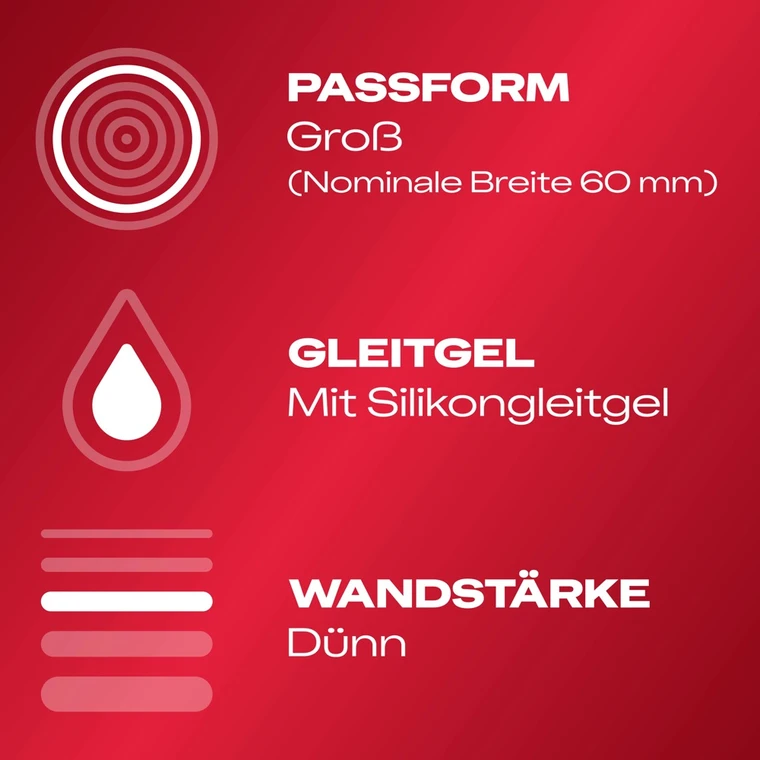 Pro větší pohodlí a intenzivní zážitky! Kondomy Durex Gefühlsecht XXL jsou navrženy tak, aby perfektně seděli a poskytovali více místa a zaručovali pohodlné nošení s maximálním komfortem.