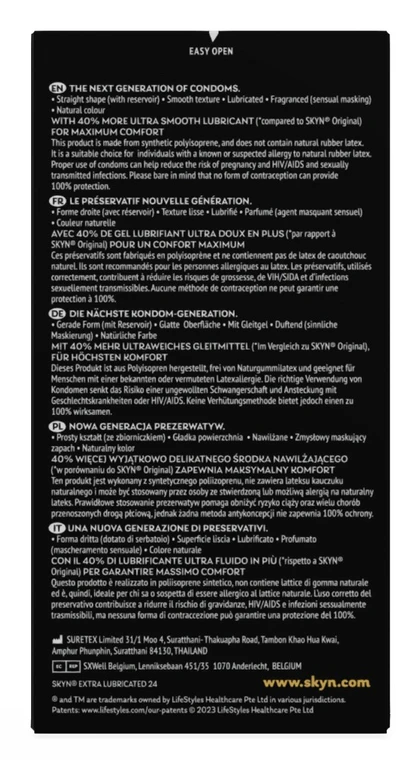 Tip: Pokud máte citlivější pokožku, kombinujte kondomy SKYN Extra Lubricated s lubrikantem SKYN Natural Harmony na vodní bázi – je 100% kompatibilní s polyisoprenem a prodlouží vaši rozkoš bez podráždění.